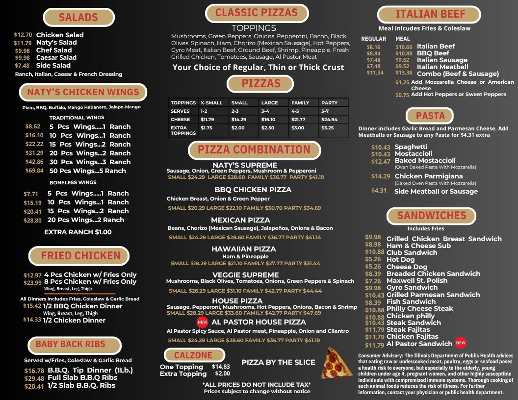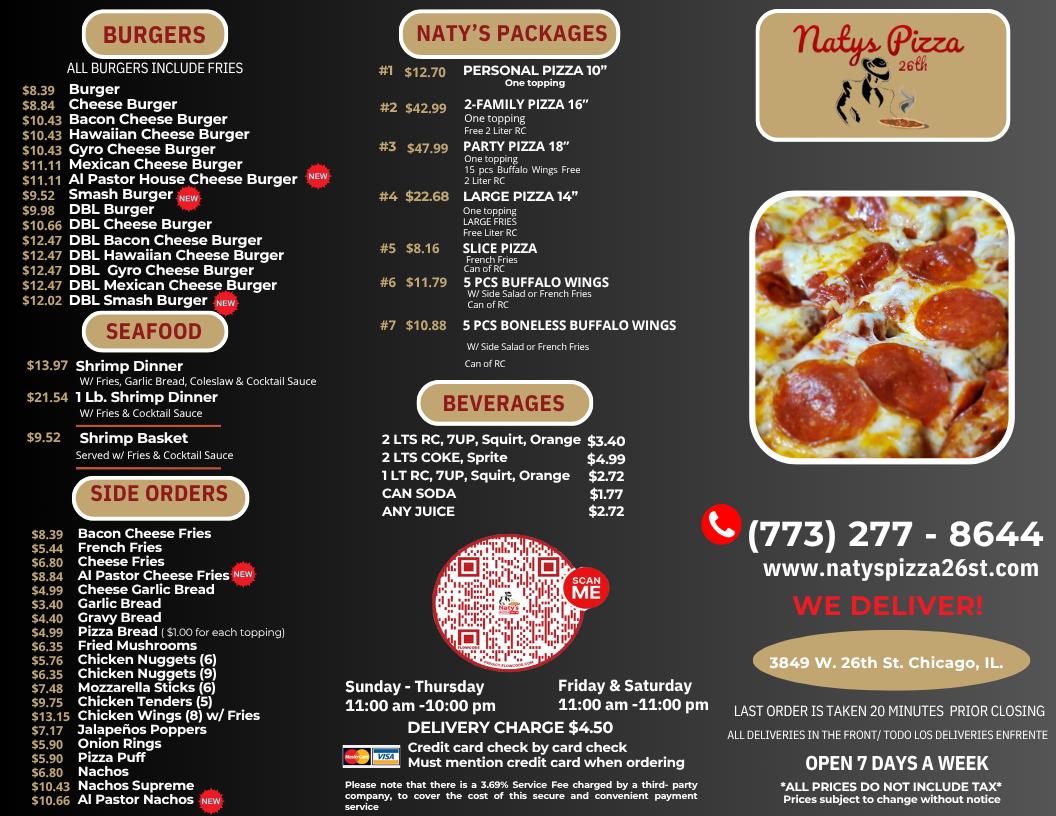 If you're craving delicious, satisfying pizza in Chicago, look no further than Naty's Pizza 26St Menu. Located at 3849 W 26th St #3810, this spot is the perfect place to dive into mouthwatering flavors that hit the spot every time. From crispy, cheesy crusts to perfectly seasoned toppings, Naty's offers a menu full of tasty options for everyone. Whether you're in the mood for a classic pepperoni, something unique like a veggie-packed slice, or even a savory specialty pizza, they’ve got you covered.